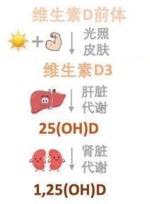 维生素D本身并没有生理功能,它是进入我们身体后经过肝脏、肾脏以及其他组织转化成1,25-(OH)2D3而在我们体内发挥作用。如下图: